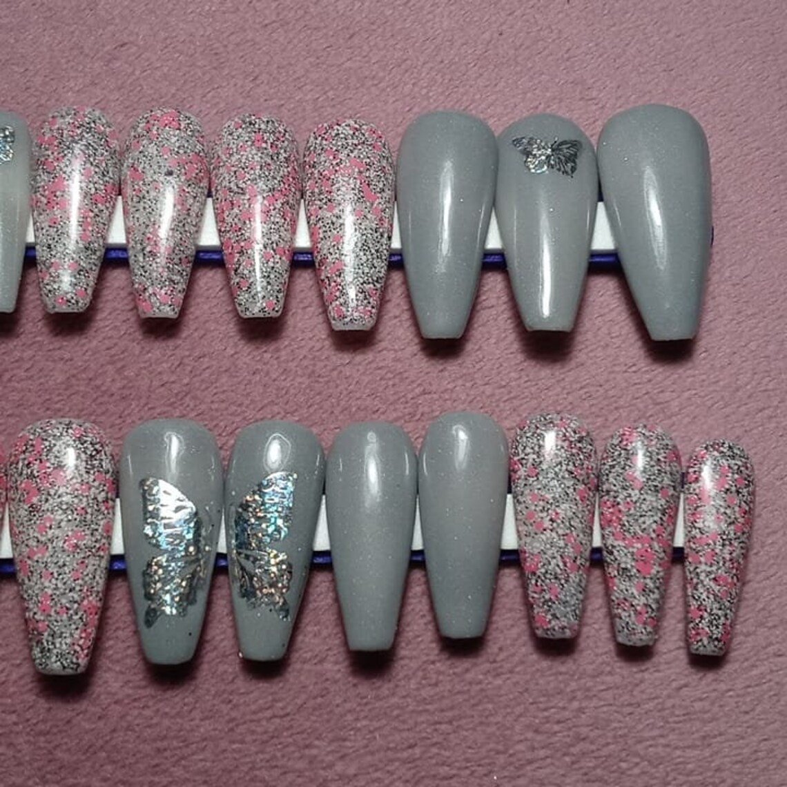 grey acrylic nails with butterflies